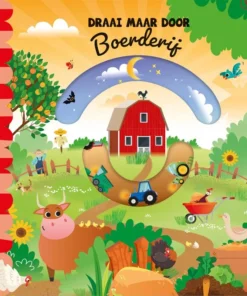 Op de boerderij is van alles te zien en te doen. In de schuur leggen de kippen een ei, in de wei staan de koeien te grazen en in de moestuin groeien kolen en wortels. Door aan de stevige schijf te draaien verschijnt er telkens iets anders in de gaatjes! Een kleurrijk boek met vrolijke rijmpjes om voor te lezen.