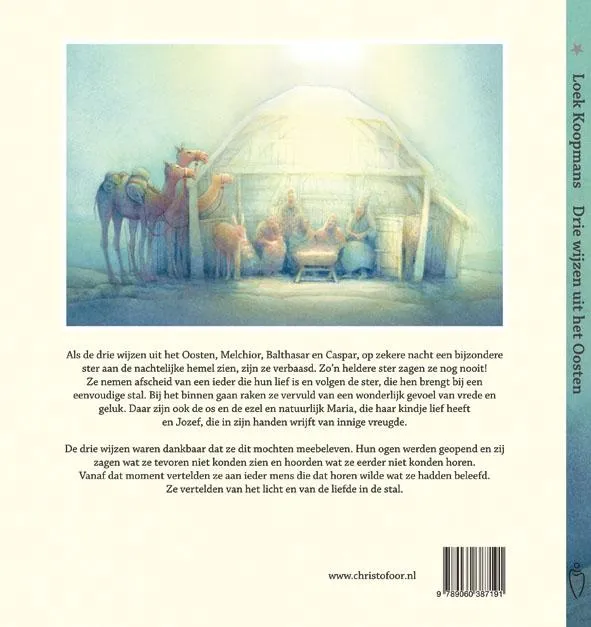 Als de drie wijzen uit het Oosten, Melchior, Balthasar en Caspar, op zekere nacht een bijzondere ster aan de nachtelijke hemel zien, zijn ze verbaasd. Zo’n heldere ster zagen ze nog nooit! Ze nemen afscheid van een ieder die hun lief is en volgen de ster, die hen brengt bij een eenvoudige stal. Bij het binnen gaan raken ze vervuld van een wonderlijk gevoel van vrede en geluk. Daar zijn ook de os en de ezel en natuurlijk Maria, die haar kindje lief heeft en Jozef, die in zijn handen wrijft van innige vreugde. De drie wijzen waren dankbaar dat ze dit mochten meebeleven. Hun ogen werden geopend en zij zagen wat ze tevoren niet konden zien en hoorden wat ze eerder niet konden horen. Vanaf dat moment vertelden ze aan ieder mens die dat horen wilde wat ze hadden beleefd. Ze vertelden van het licht en van de liefde in de stal.