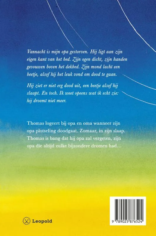 Thomas logeert bij opa en oma wanneer zijn opa plotseling doodgaat. Zomaar, in zijn slaap. Thomas is bang dat hij opa zal vergeten, zijn opa die altijd zulke bijzondere dromen had…<br>