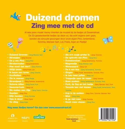 Al vele jaren maakt Henny Vrienten de muziek bij de liedjes uit Sesamstraat. De 33 geselecteerde liedjes op deze cd, die echt ergens over gaan, worden als vanouds gezongen door onze eigen Pino, Ieniemienie, Tommie, Meneer Aart, Lot, Frank, Arjan en Peetje! Zing mee met de cd!