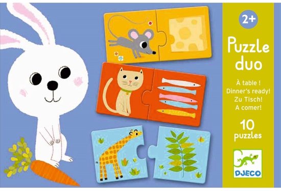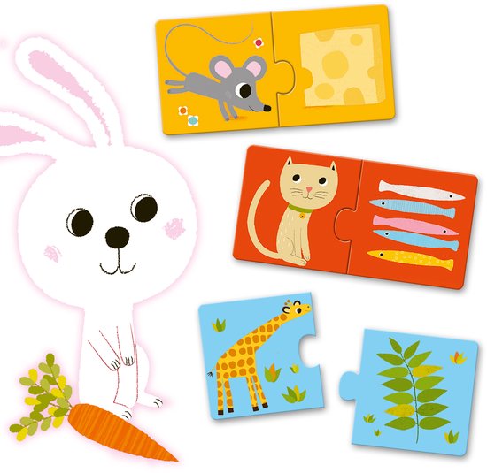 Tien kartonnen puzzeltjes van het merk Djeco voor de jonge beginnende puzzelaar. Ieder puzzeltje bestaat uit tweee stukjes. Associeer het diertje bij het passende eten en puzzel ze aan elkaar! De aap eet een banaan, de giraf eet blaadjes uit de boom, de poes houdt van vis etc.