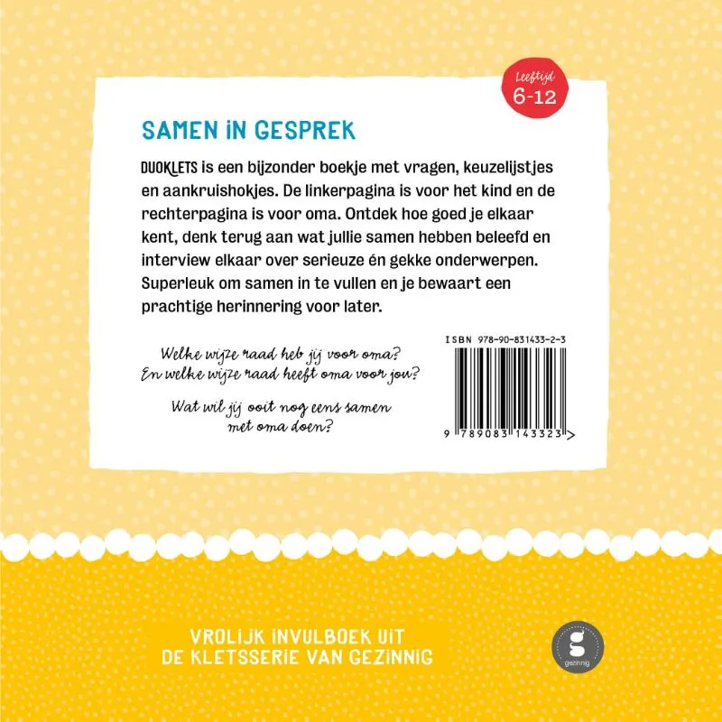 Vrolijk invulboek uit de kletsserie van Gezinnig. Samen in gesprek met Duoklets: een bijzonder boekje met vragen, keuzelijstjes en aankruishokjes. Elke linkerpagina is voor het kind en elke rechterpagina is voor oma. Welke wijze raad heb jij voor oma? En welke wijze raad heeft oma voor jou? Wat wil jij ooit nog eens samen met oma doen? Ontdek hoe goed je elkaar kent, denk terug aan wat jullie samen hebben beleefd en interview elkaar over serieuze én gekke onderwerpen. Superleuk om samen in te vullen en je bewaart een prachtige herinnering voor later. Geschikt voor kinderen van 6 tot 12 jaar.
