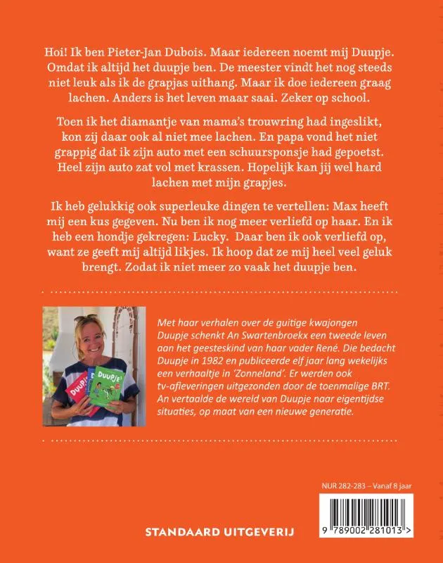 In de jaren tachtig en negentig waren de dagboekverhaaltjes van Duupje razend populair. René Swartenbroekx schreef ze voor het jeugdmagazine Zonneland, en ze werden ook in boekvorm uitgegeven. Onder de vleugels van Renés dochter An en in de tekeningen van jong talent Dieter Steenhaut begon het figuurtje aan een tweede leven dat zich met beide benen in het nu afspeelt. Na het succes van de eerste drie verhalenbundels, is er nu ook een vierde deel. Ook in deze nieuwe verhaaltjes wordt Pieter-Jan Dubois maar al te vaak de dupe van zijn hilarische en avontuurlijke ideeën. Opnieuw wordt er volop ingezet op herkenbaarheid, met thema’s en onderwerpen die dicht aanleunen bij de leefwereld van lagereschoolkinderen, die zich vlot identificeren met deze belhamel met zijn gouden hart en goede bedoelingen. Want wie voelt zich nu nooit eens het duupje?