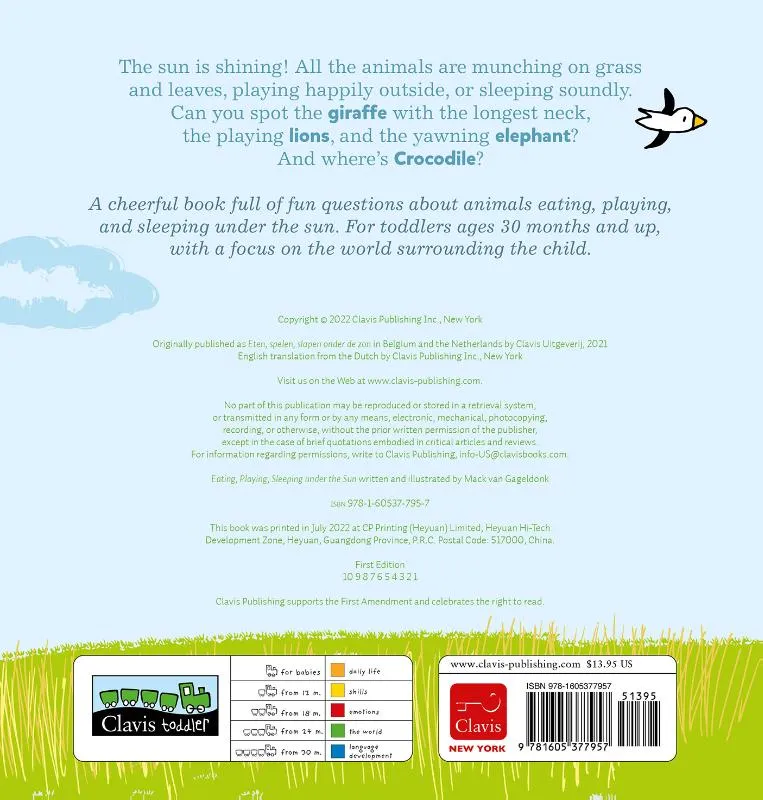 Weet je welke wilde dieren van de warme zon genieten? Giraf, Neushoorn, Leeuw en Krokodil maar ook de familie Zebra en Olifant. Leeuw weet een leuk spelletje en Olifant is graag ondeugend. Kun je alle dieren in het hoge gras vinden, en welk dier kan goed gapen? Interactief vierkant, hardkartonnen prentenboek met rustige illustraties in frisse kleuren. Vanaf ca. 2,5 jaar.