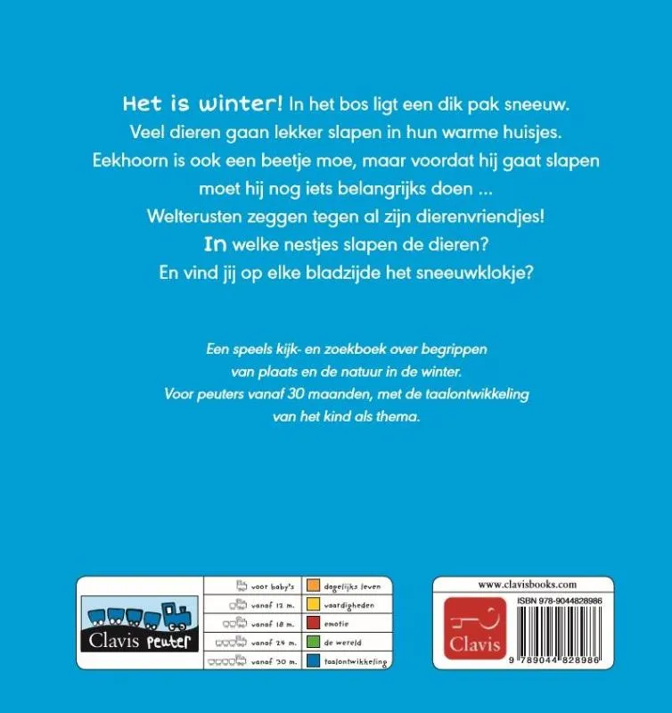 Een speels kijk- en zoekboek over begrippen van plaats en natuur in de winter. Voor peuters vanaf 30 maanden, met de taalontwikkeling van het kind als thema.