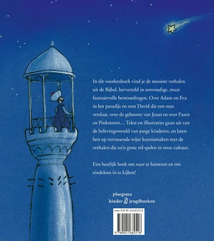 In dit voorleesboek vind je de mooiste verhalen uit de Bijbel, herverteld in eenvoudige, maar fantasievolle bewoordingen. Over Adam en Eva in het paradijs en over David die een reus verslaat, over de geboorte van Jezus en over Pasen en Pinksteren… Tekst en illustraties gaan uit van de belevingswereld van jonge kinderen, en laten hen op verrassende wijze kennismaken met de verhalen die zo’n grote rol spelen in onze cultuur.<br>