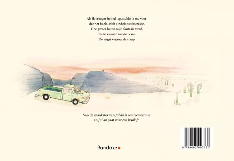 Een kind gaat samen met papa naar de woestijn om de sterrenhemel te bekijken en ontdekt dat het grote heelal minder eng is dan gedacht. Prentenboek met gekleurde illustraties. Vanaf ca. 5 jaar.
