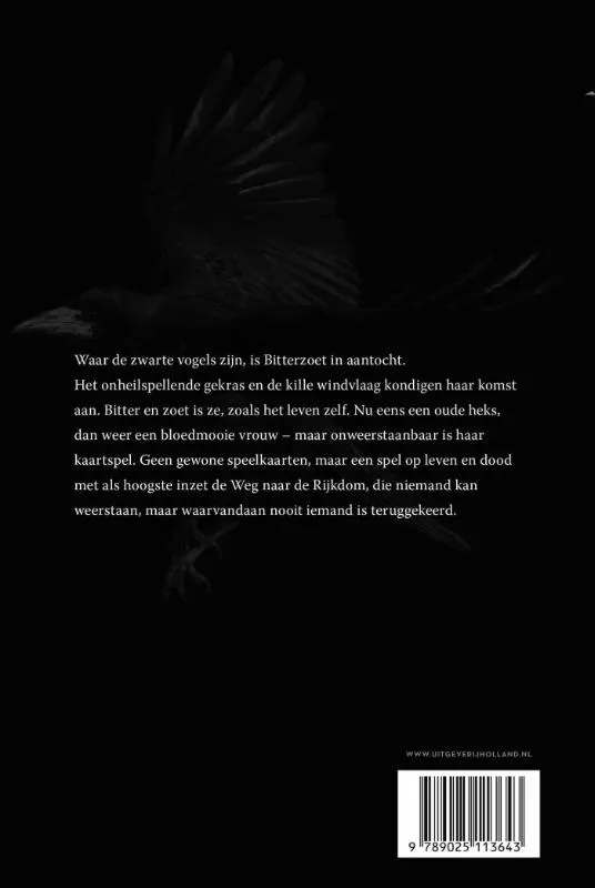 “Weg naar de rijkdom? Een kille windvlaag, krassende kraaien en een bloedmooie vrouw.”Waar de zwarte vogels zijn, is Bitterzoet. Het onheilspellende gekras en de kille windvlaag kondigt haar komst aan. Bitter en zoet is ze, zoals het leven zelf. Nu eens een oude heks, dan weer een bloedmooie vrouw – maar onweerstaanbaar is haar kaartspel. Geen gewone speelkaarten, maar een spel van leven op dood met als hoogste inzet De Weg naar de Rijkdom, die niemand kan weerstaan, maar waarvan nooit iemand is teruggekeerd.Van Rom Molemaker verscheen eerder:De kleur van bloed (ISBN 9789025113223)Moord op school (ISBN 9789025112875)Uit de schaduw (ISBN 9789025112509)Drijfjacht (ISBN 9789025112073)Crisis (ISBN 9789025111809)
