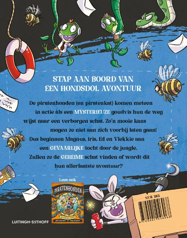Magnus, Iris, Ed en Vlekkie zijn terug voor een gloednieuw avontuur. Na hun belevenissen in De gebeten hond stuiten de drie piratenhonden en één kat op een nieuw mysterie. Een raadselachtige goudvis wijst hun de weg naar een lang verloren gewaande schat, diep verborgen in een geheime grot. Zo’n kans kunnen ze niet voorbij laten gaan, toch? Dus waagt het viertal zich aan een gevaarlijke tocht door de jungle. Zullen ze de legendarische grot vinden – of wordt dit hun allerlaatste avontuur?