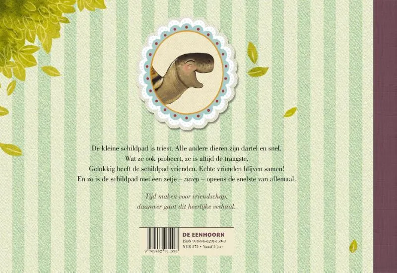Kleine schildpad is triest. Alle andere dieren zijn dartel en snel. Wat ze ook probeert, ze is altijd de traagste. Gelukkig heeft schildpad vrienden. Echte vrienden werken samen! En zo is schildpad met een zetje en jouw hulp – zwiep – opeens de snelste van allemaal.