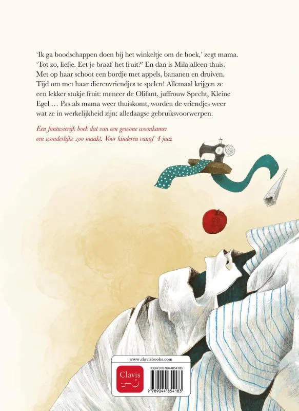 ‘Ik ga boodschappen doen bij het winkeltje om de hoek,’ zegt mama. ‘Tot zo, liefje. Eet je braaf het fruit?’ En dan is Mila alleen thuis. Met op haar schoot een bordje met appels, bananen en druiven. Tijd om met haar dierenvriendjes te spelen! Allemaal krijgen ze een lekker stukje fruit: meneer de Olifant, juffrouw Specht, Kleine Egel … Pas als mama weer thuiskomt, worden de vriendjes weer wat ze in werkelijkheid zijn: alledaagse gebruiksvoorwerpen.