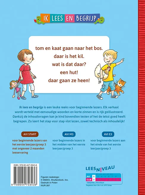tom en kaat gaan naar het bos.daar is het kil.wat is dat daar?een hut!daar gaan ze heen!Ik lees en begrijp is een leuke reeks voor beginnende lezers. Elk verhaalwordt verteld met eenvoudige woorden en korte zinnen en is rijk geïllustreerd.Dankzij de inhoudsvragen kan je kind bovendien testen of het de tekst goed heeftbegrepen. Zo leert het stap voor stap vlot lezen, zowel technisch als inhoudelijk!Tekst op leesniveau AVI START / AVI 1