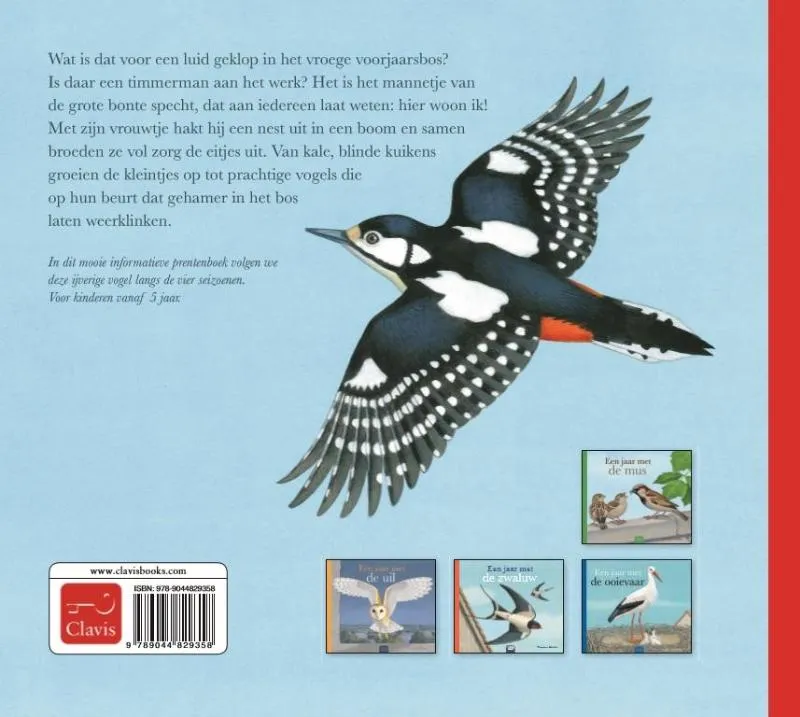 Wat is dat voor een luid geklop in het vroege voorjaarsbos? Is daar een timmerman aan het werk? Het is het mannetje van de grote bonte specht, dat aan iedereen laat weten: hier woon ik! Met zijn vrouwtje hakt hij een nest uit in een boom en samen broeden ze vol zorg de eitjes uit. Van kale, blinde kuikens groeien de kleintjes op tot prachtige vogels die op hun beurt dat gehamer in het bos laten weerklinken.
