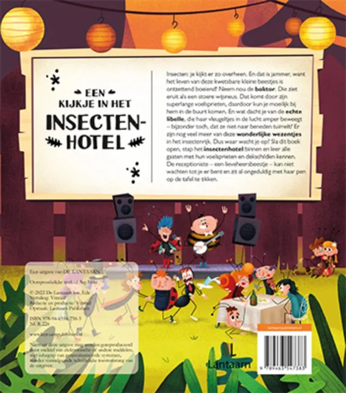 Insecten: je kijkt er zo overheen. En dat is jammer, want het leven van deze kwetsbare beestjes is ontzettend boeiend! Neem nou de boktor. Die ziet eruit als een stoere wijsneus. Dat komt door zijn superlange voelsprieten, daardoor kun je moeilijk bij hem in de buurt komen. En wat dacht je van de echte libelle, die haar vleugeltjes in de lucht amper beweegt – bijzonder toch dat ze niet naar beneden tuimelt? Er zijn nog meer van deze wonderlijke wezentjes in het insectenrijk. Dus waar wacht je nog op? Sla dit boek open, stap het insectenhotel binnen en leer alle gasten met hun voelsprieten en dekschilden kennen. De receptioniste -een lieveheersbeestje- kan niet wachten tot je er bent en zit al ongeduldig met haar pen op de tafel te tikken! Zie ook ons andere thema; Een kijkje in het Dierenbos!