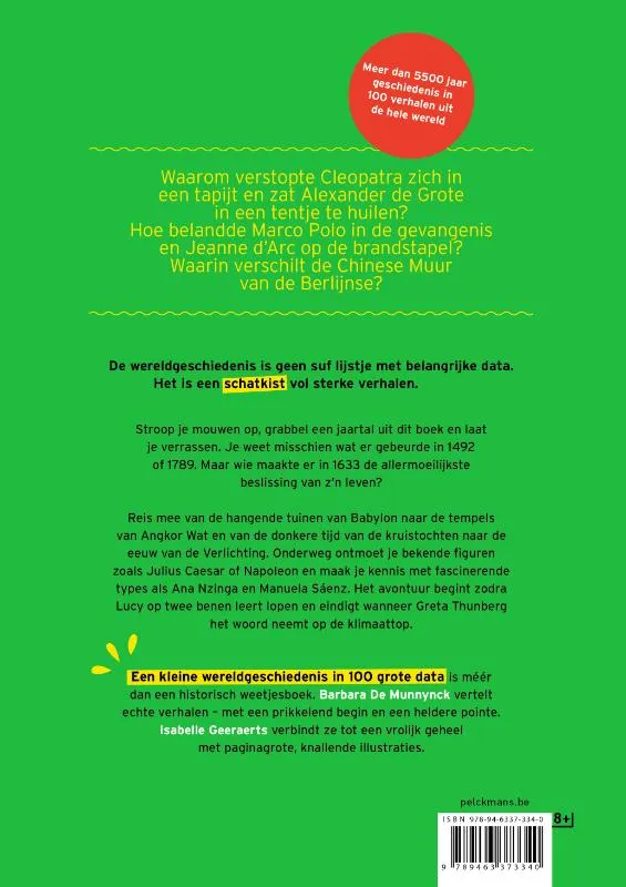 Een kleine wereldgeschiedenis in 100 grote data is méér dan een historisch weetjesboek. Barbara De Munnynck vertelt echte verhalen – met een prikkelend begin en een heldere pointe. Isabelle Geeraerts verbindt ze tot een vrolijk geheel met paginagrote, knallende illustraties.