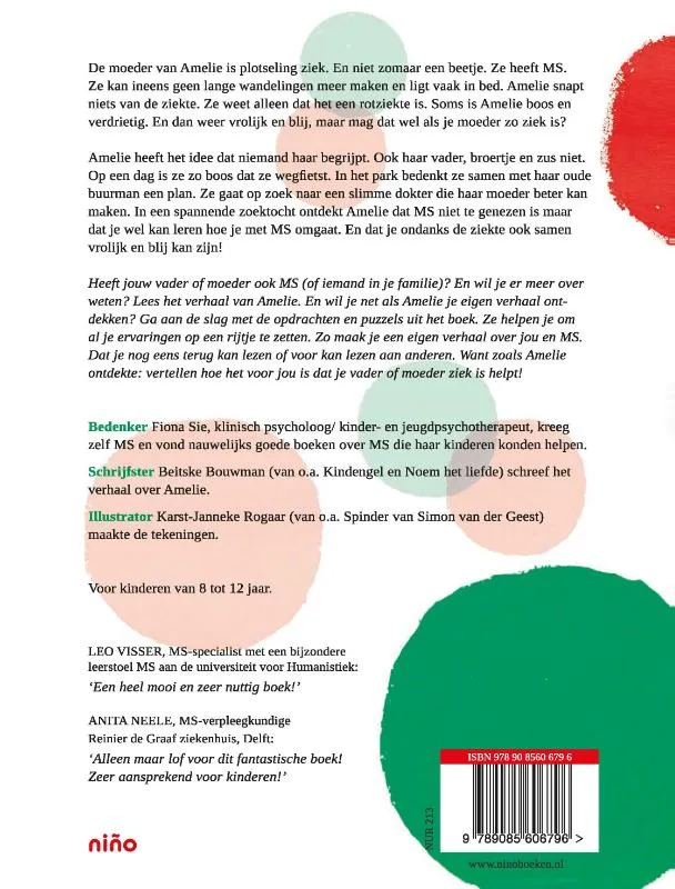 Amelie is 9 jaar als haar moeder plotseling ziek wordt. Ze begrijpt niets van de ziekte van haar moeder. Het enige dat ze weet is dat het een rotziekte is die nooit meer overgaat. Thuis is opeens helemaal geen fijn thuis meer. Ze weet zich geen raad met haar gevoelens. Soms is ze heel boos, dan weer heel verdrietig. En soms ook gewoon wel vrolijk, maar mag dat wel als je moeder zo ziek is? Ze heeft het idee dat niemand haar begrijpt. Ook haar kleine broertje Jonathan en haar grote zus Nina niet. Behalve haar oude buurman. Hij lijkt wel te willen luisteren en geeft haar soms ook nog goede raad. Zo’n goede raad dat ze op zoek gaat naar een slimme dokter die haar moeder beter kan maken. Maar dat lukt natuurlijk niet. Wel schrijft de dokter haar een mooie brief en leert Amelie en vooral ook haar gezin hoe ze de ziekte een plek in hun leven kunnen geven.