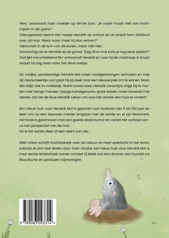 Een nieuw huis voor Hendrik Mol is geschikt voor kinderen van 0 tot 100 jaar en leert ons op een bewuste manier omgaan met de aarde en al zijn bewoners. Het boek is geschreven met een goede dosis humor en vertelt het verhaal vanuit het perspectief van de mol.