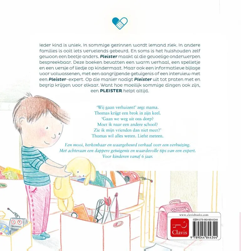 Ieder kind is uniek. In sommige gezinnen wordt iemand ziek. In andere families is ooit iets vervelends gebeurd. En soms is het huishouden zelf gewoon een beetje anders. Pleister maakt al die gevoelige onderwerpen bespreekbaar. Deze boeken bevatten een warm verhaal, een spelletje en een versje of liedje op kindermaat. Maar ook een informatieve bijlage voor volwassenen, met een aangrijpende getuigenis of een interview met een Pleister-expert. Op die manier nodigt Pleister uit tot praten met en begrip krijgen voor elkaar. Want hoe moeilijk sommige dingen ook zijn, een PLEISTER helpt altijd.