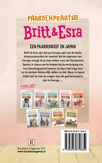 In Een paardendief in Japan van Joke Reijnders vliegen Britt en Esra naar Japan om de eigenaar van dressuurpaard George te helpen tijdens de Olympische Spelen. Maar dat loopt niet zoals gepland…
