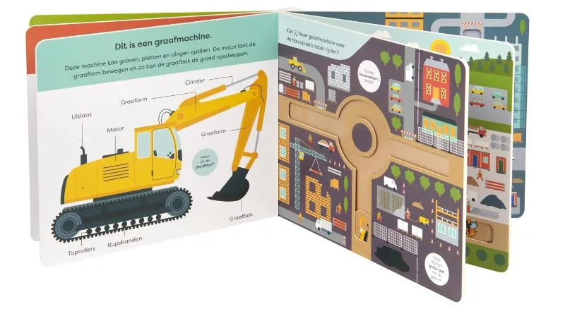 In het dikke kartonboek ‘Een rondje over de bouwplaats’ maken lezertjes eerst kennis met een groot voertuig dat gebruikt wordt in de bouw. Daarna kunnen ze het zelf een rondje laten rijden! Met hun vinger kunnen ze de bulldozer, graafmachine, kiepwagen en shovel over de hele bouwplaats sturen. Het boek van Johnny Dyrander zit vol interessante weetjes over de grootste bouwmachines, eenvoudig en strak weergegeven in heldere kleuren.