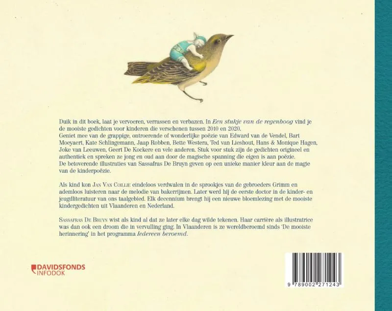 Duik in dit boek, laat je vervoeren, verrassen en verbazen. In Een stukje van de regenboog vind je de mooiste gedichten voor kinderen die verschenen tussen 2010 en 2020.Geniet mee van de grappige, ontroerende of wonderlijke poëzie van Edward van de Vendel, Bart Moeyaert, Kate Schlingemann, Jaap Robben, Bette Westera, Ted van Lieshout, Hans & Monique Hagen, Joke van Leeuwen, Geert De Kockere en vele anderen. Stuk voor stuk zijn de gedichten origineel en authentiek en spreken ze jong en oud aan door de magische spanning die eigen is aan poëzie.De betoverende illustraties van Sassafras De Bruyn geven op een unieke manier kleur aan de magie van de kinderpoëzie.