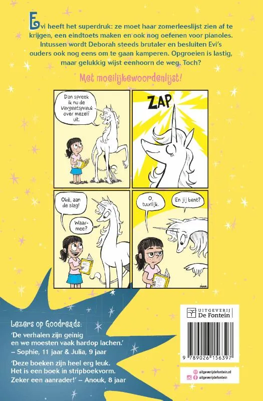Basisschoolproblemen en de worsteling om jezelf te zijn vermengd met narcisme (eenhoorn), sarcasme (Evi) en een vleugje magie: deze serie is smullen voor lezers van heel veel leeftijden. Alle delen zijn los te lezen.