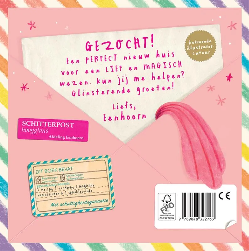 GEZOCHT!Een PERFECT nieuw huis voor een LIEF en MAGISCH wezen. Kun jij me helpen? Glinsterende groeten!Liefs,EenhoornOp een dag vol regenbogen vindt een klein meisje een eenhoorn die op de deur van haar boomhut klopt. De eenhoorn moet verdwaald zijn! Gelukkig weet het meisje precies wat ze moet doen. Samen bezoeken ze plekken in de stad om te zien of ze het huis van de eenhoorn kunnen vinden. Van de dierenwinkel tot de kermis. En misschien ontdekken ze wel dat het perfecte huis veel dichterbij is dan ze dachten. Een betoverend boek over een meisje en een eenhoorn, met 5 magische verrassingen om te openen!
