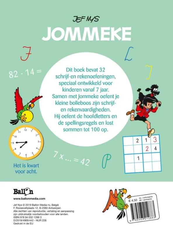 Dit boek bevat 32 schrijf-en rekenoefeningen, speciaal ontwikkeld voor kinderen vanaf 7 jaar. Samen met Jommeke oefent je kleine bolleboos zijn schrijfen rekenvaardigheden. Hij oefent de hoofdletters en de spellingsregels en lost sommen tot 100 op. De Jommeke-illustraties maken al dat tel-, reken- en schrijfwerk extra leuk!