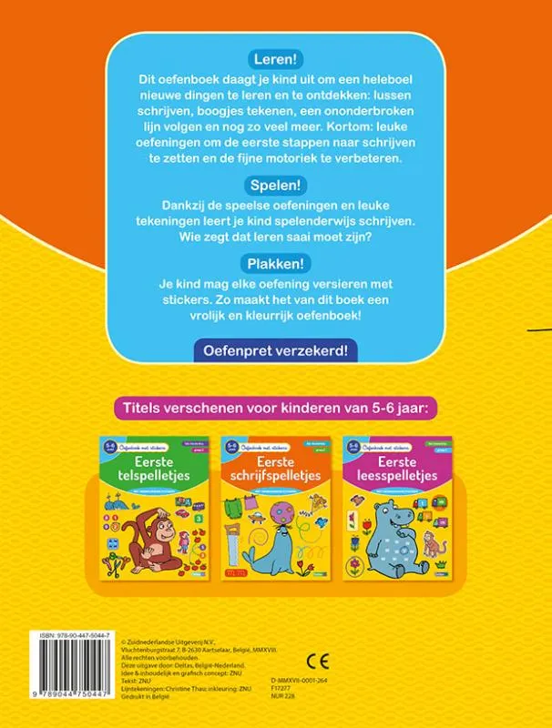 Leren! Dit oefenboek daagt je kind uit om een heleboel nieuwe dingen te leren en te ontdekken: lussen schrijven, boogjes tekenen, een ononderbroken lijn volgen en nog zo veel meer. Kortom: leuke oefeningen om de eerste stappen naar schrijven te zetten en de fijne motoriek te verbeteren. Spelen! Dankzij de speelse oefeningen en leuke tekeningen leert je kind spelenderwijs schrijven. Wie zegt dat leren saai moet zijn? Plakken! Je kind mag elke oefening versieren met stickers. Zo maakt het van dit boek een vrolijk en kleurrijk oefenboek! Oefenpret verzekerd!