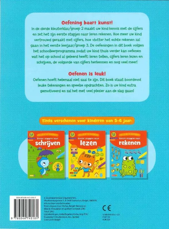 In de derde kleuterklas/groep 2 maakt uw kind kennis met de cijfers en zet het zijn eerste stapjes naar leren rekenen. Hoe meer uw kind vertrouwd geraakt met cijfers, hoe vlotter het echte rekenen zal gaan in het eerste leerjaar/groep 3. De oefeningen in dit boek volgen het schoolleerprogramma zodat uw kind thuis verder kan oefenen wat het op school al geleerd heeft: leren tellen, cijfers leren lezen en schrijven, de volgorde van cijfers herkennen en nog veel meer!