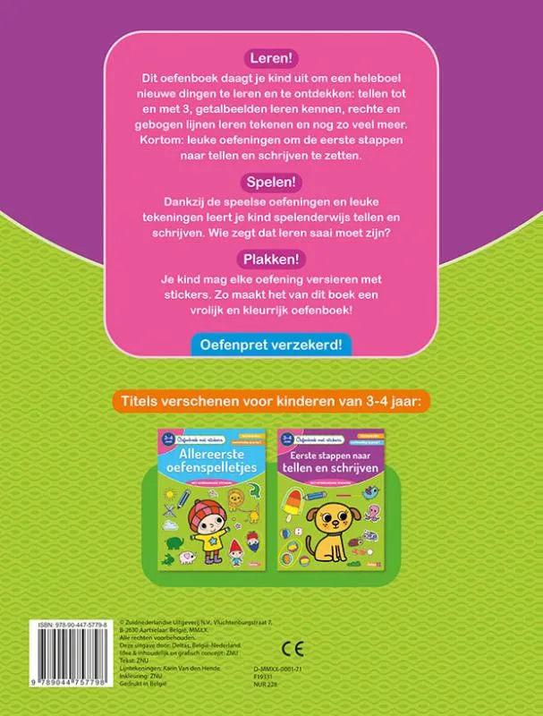 Dit oefenboek daagt je kind uit om een heleboel nieuwe dingen te leren en te ontdekken: tellen tot en met 3, getalbeelden leren kennen, rechte en gebogen lijnen leren tekenen en nog zo veel meer. Dankzij de speelse oefeningen en leuke tekeningen leert je kind spelenderwijs tellen en schrijven. Bovendien zitten er stickers bij waarmee uw kind de oefeningen kan versieren. Zo maakt het van dit boek een vrolijk en kleurrijk oefenboek!
