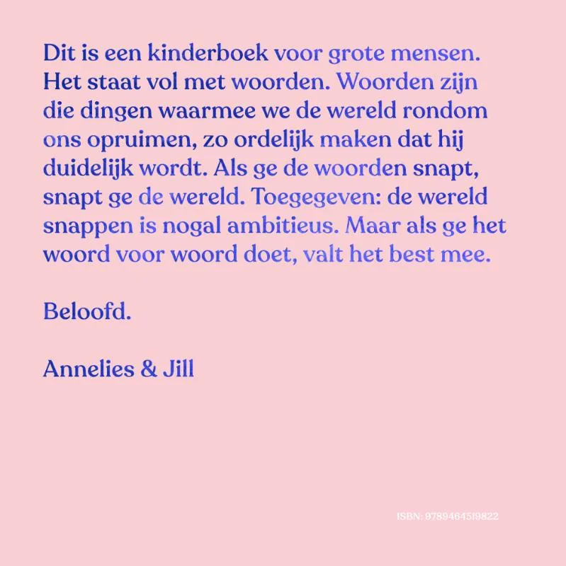Dit is een kinderboek voor grote mensen. Het staat vol met woorden. Woorden zijn die dingen waarmee we de wereld rondom ons opruimen, zo ordelijk maken dat hij duidelijk wordt. Als ge de woorden snapt, snapt ge de wereld.