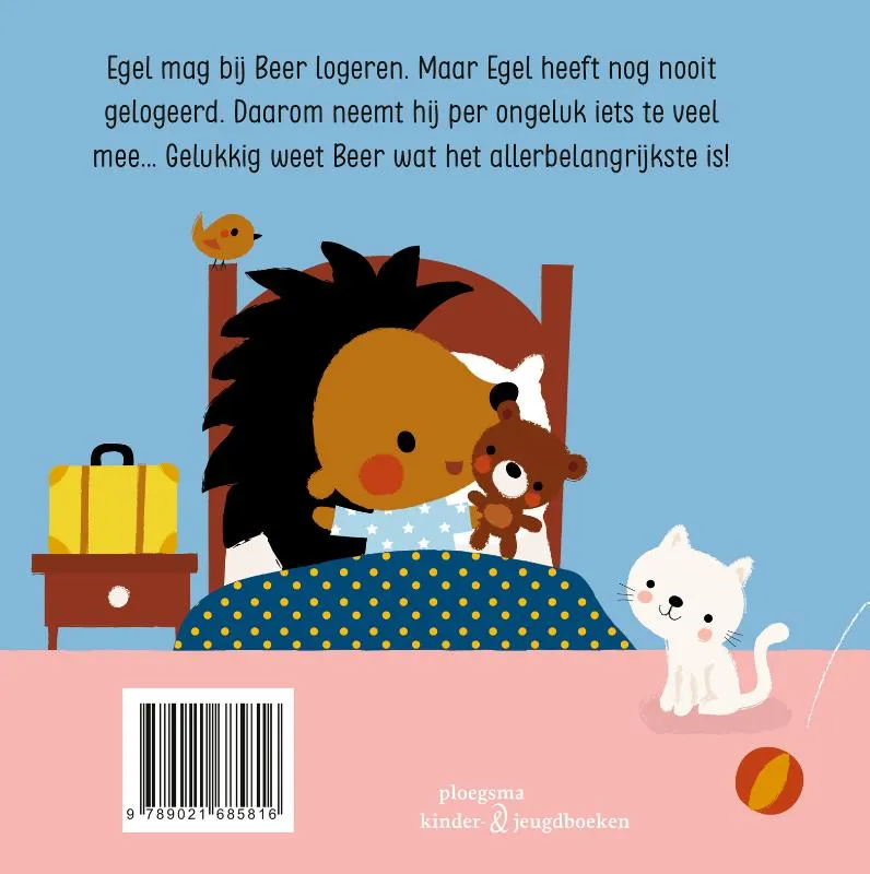Egel mag bij Beer logeren. Maar Egel heeft nog nooit ergens gelogeerd. Daarom neemt hij per ongeluk iets te veel mee… Gelukkig weet Beer wat het allerbelangrijkste is!