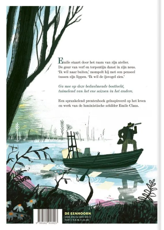 Emile staart door het raam van zijn atelier. De geur van verf en terpentijn danst in zijn neus. ‘Ik wil naar buiten,’ mompelt hij met een penseel tussen zijn lippen. ‘Ik wil de ijsvogel zien.’ Het is het begin van een bedwelmende boottocht, waarin Emile Claus tussen de natuur en de dorpelingen de rivier afvaart, tuimelend van het ene seizoen in het andere. Bij elk nieuw schilderij zinkt zijn bootje wat dieper in de rivier. Zal Emile de ijsvogel zien?