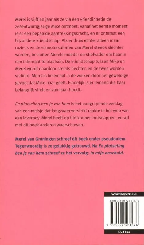 Merel van Groningen schreef dit boek onder pseudoniem. Tegenwoordig is ze gelukkig getrouwd. Na En plotselingben je van hem schreef ze het vervolg: In mijn onschuld.