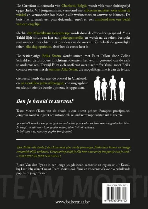 De Carrefour supermarkt van Charleroi, België, wordt vlak voor sluitingstijd opgeschrikt. Vijf jongemannen, vermomd met siliconen maskers, overvallen de winkel en vermoorden koelbloedig alle werknemers en aanwezige klanten. De buit lijkt schamel: een paar duizenden euro’s en een armband met een bedel van een engeltje. Slechts één Marokkaans tienermeisje wordt door de overvallers gespaard. Yuna Tahiri lijdt sinds een jaar aan geheugenverlies en wordt na de feiten bestookt met mails en berichten met beelden van de overval. Ze beleeft de gruwelijke feiten elke dag opnieuw, alsof het de eerste keer is. De zestienjarige Erika Storm wordt samen met Felix Tallon door Celine Schield en de Europese inlichtingendiensten het veld in gestuurd om de zaak te onderzoeken. Terwijl Felix zich ontfermt over slachtoffer Yuna, moet Erika contact zoeken met de turnster Aiko Svilar, die mogelijk gelinkt is aan de feiten. Gevreesd wordt dat met de overval in Charleroi, en na tientallen jaren stilzwijgen, een ongrijpbare en nietsontziende bende opnieuw is opgestaan.