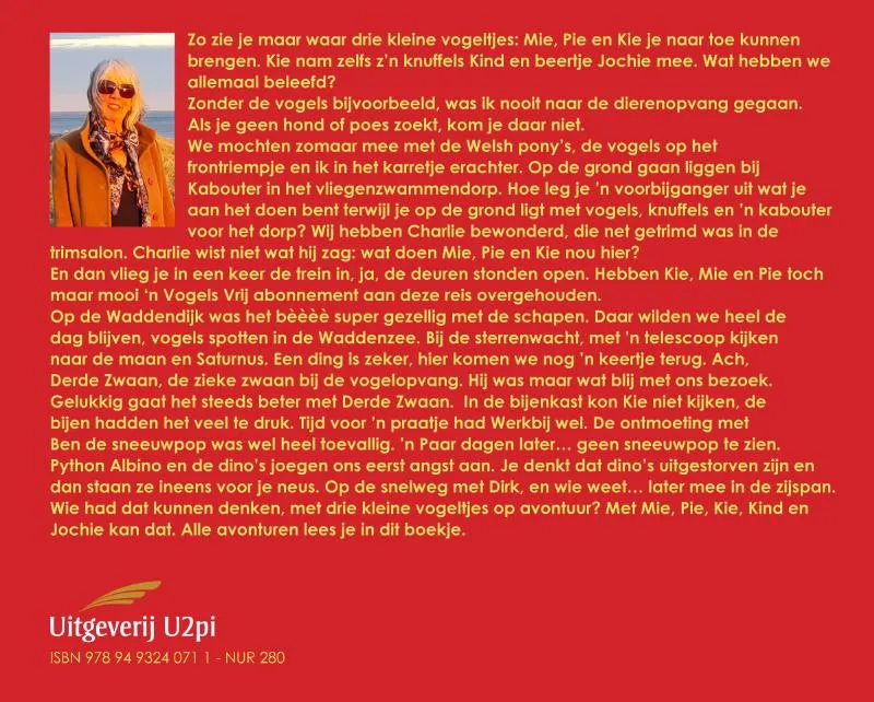 Op de Waddendijk was het bèèèè super gezellig met de schapen. Daar wilden we heel de dag blijven, vogels spotten in de Waddenzee. Bij de sterrenwacht, met ’n telescoop kijken naar de maan en Saturnus. Een ding is zeker, hier komen we nog ’n keertje terug. Ach, Derde Zwaan, de zieke zwaan bij de vogelopvang. Hij was maar wat blij met ons bezoek. Gelukkig gaat het steeds beter met Derde Zwaan. In de bijenkast kon Kie niet kijken, de bijen hadden het veel te druk. Tijd voor ’n praatje had Werkbij wel. De ontmoeting met Ben de sneeuwpop was wel heel toevallig. ’n Paar dagen later… geen sneeuwpop te zien. Python Albino en de dino’s joegen ons eerst angst aan. Je denkt dat dino’s uitgestorven zijn en dan staan ze ineens voor je neus. Op de snelweg met Dirk, en wie weet… later mee in de zijspan. Wie had dat kunnen denken, met drie kleine vogeltjes op avontuur? Met Mie, Pie, Kie, Kind en Jochie kan dat. Alle avonturen lees je in dit boekje.