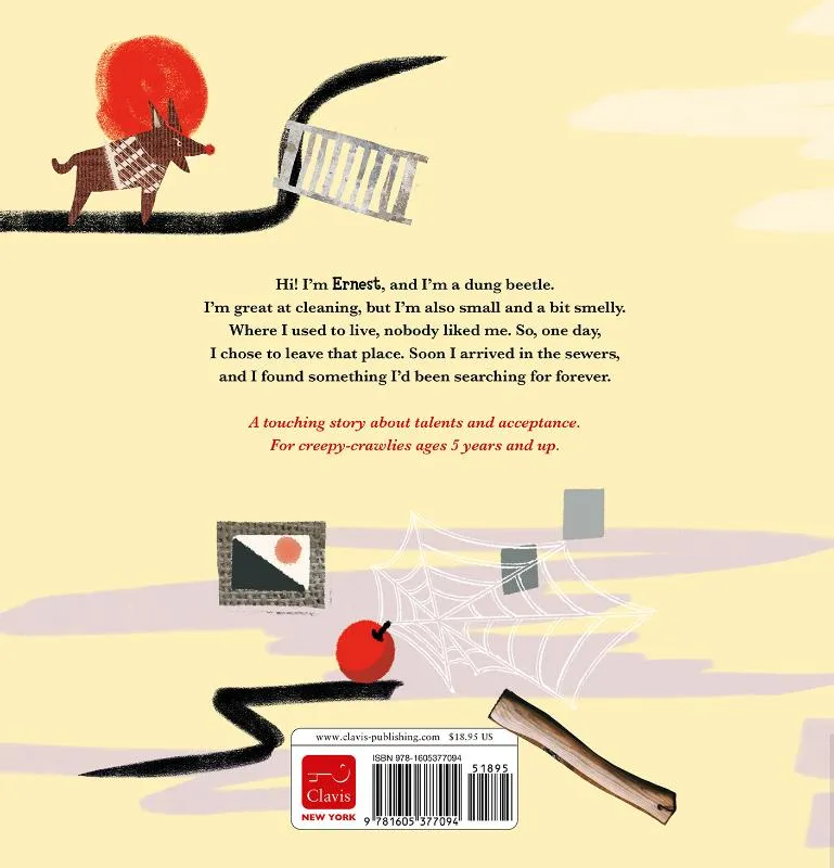 Hi! I’m Ernest, and I’m a dung beetle. I’m great at cleaning, but I’m also small and a bit smelly. Where I used to live, nobody liked me. So, one day, I chose to leave that place. Soon I arrived in the sewers, and I found something I’d been searching for forever.