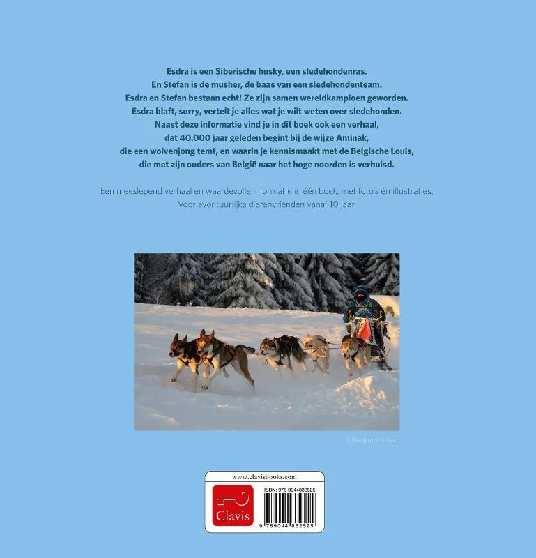 Esdra is een Siberische husky, een sledehondenras. En Stefan is de musher, de baas van een sledehondenteam. Esdra en Stefan bestaan echt! Ze zijn samen wereldkampioen geworden. Esdra blaft, sorry, vertelt je alles wat je wilt weten over sledehonden. Naast deze informatie vind je in dit boek ook een verhaal, dat 40.000 jaar geleden begint bij de wijze Aminak, die een wolvenjong temt, en waarin je kennismaakt met de Belgische Louis, die met zijn ouders van België naar het hoge noorden is verhuisd.