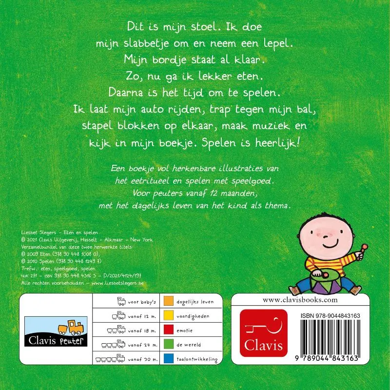 Een boekje vol herkenbare illustraties van het eetritueel en spelen met speelgoed. Voor peuters vanaf 12 maanden, met het dagelijks leven van het kind als thema.