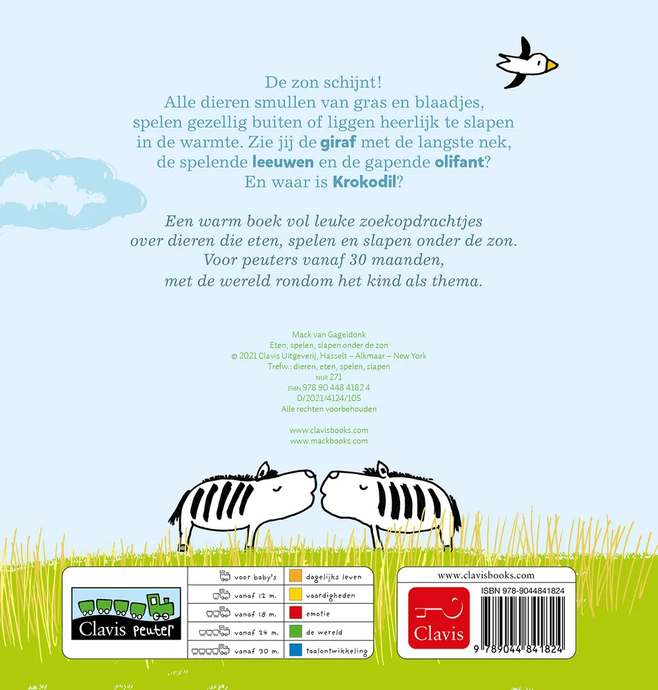 De zon schijnt! Alle dieren smullen van gras en blaadjes, spelen gezellig buiten of liggen heerlijk te slapen in de warmte. Zie jij de giraf met de langste nek, de spelende leeuwen en de gapende olifant? En waar is Krokodil?