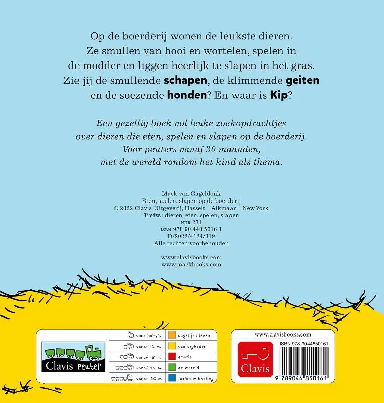 Op de boerderij wonen de leukste dieren. Ze smullen van hooi en wortelen, spelen in de modder en liggen heerlijk te slapen in het gras. Zie jij de smullende schapen, de klimmende geiten en de soezende honden? En waar is Kip?