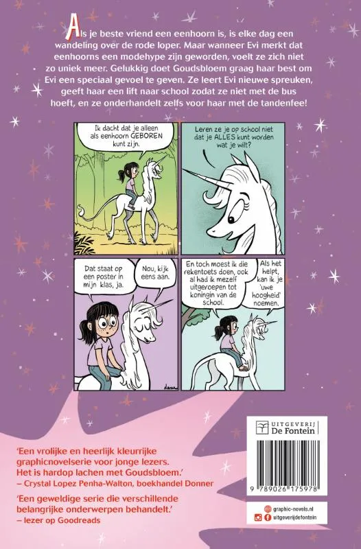 Als je beste vriend een eenhoorn is, is het elke dag een wandeling over de rode loper. Goudsbloem zet Evi graag in het zonnetje. Maar wanneer Evi merkt dat eenhoorns een modehype zijn geworden, voelt ze zich niet zo uniek meer. Gelukkig doet Goudsbloem graag haar best om Evi een speciaal gevoel te geven. Ze leert Evi nieuwe spreuken, geeft haar een lift naar school zodat ze niet met de bus hoeft, en onderhandelt zelfs voor haar met de tandenfee!<br> <br> <br> <br>