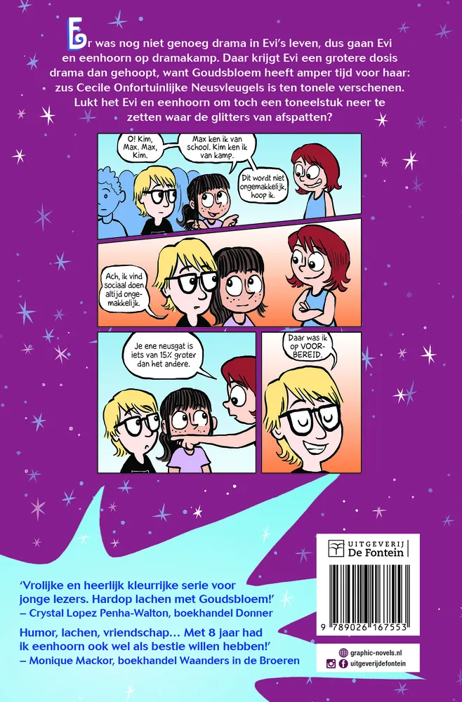 Er was nog niet genoeg drama in Evi’s leven, dus gaan Evi en eenhoorn op dramakamp. Daar krijgt Evi een grotere dosis drama dan gehoopt, want Goudsbloem heeft amper tijd voor haar: zus Cecile Onfortuinlijke Neusvleugels is ten tonele verschenen.