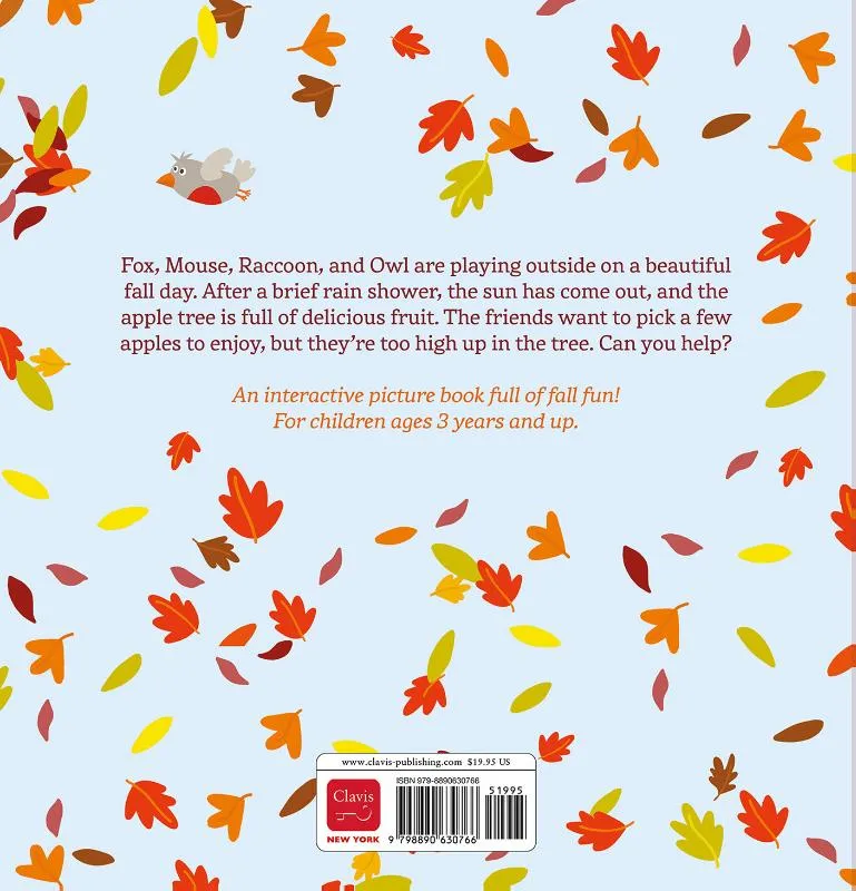 Fox, Mouse, Raccoon, and Owl are playing outside on a beautiful fall day. After a brief rain shower, the sun has come out, and the apple tree is full of delicious fruit. The friends want to pick a few apples to enjoy, but they’re too high up in the tree. Can you help? An interactive picture book full of fall fun! For children ages 3 years and up.