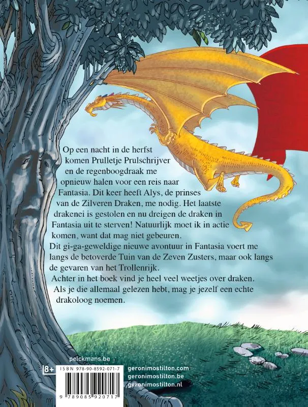 Op een nacht in de herfst komen Prulletje Prulschrijver en de Regenboogdraak me opnieuw halen voor een reis naar Fantasia. Dit keer heeft Alys, de prinses van de zilveren draken me nodig. Het laatste drakenei is gestolen, en nu dreigen de draken in Fantasia uit te sterven! Natuurlijk moet ik in actie komen, want dat mag niet gebeuren. Dit gi-ga-geweldige nieuwe avontuur in Fantasia voert me langs de betoverde tuin van de Zeven Zusters, maar ook langs de gevaren van het Trollenrijk. Achterin het boek vind je heel veel informatie over draken. Als je die allemaal gelezen hebt, mag je jezelf een echte drakoloog noemen!
