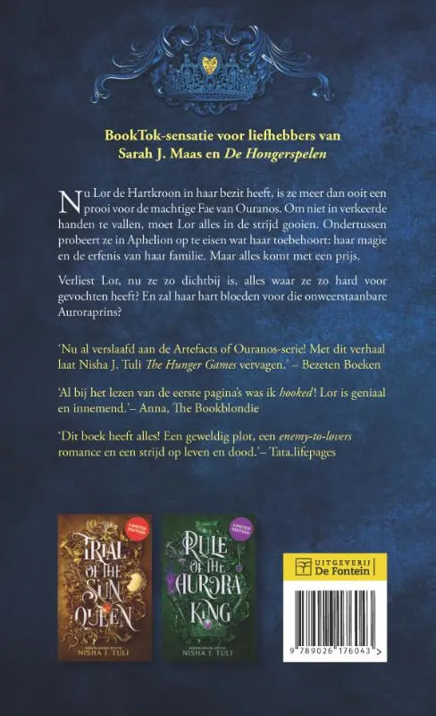 Fate of the Sun Queen, deel 3 in de serie Artefacts of Ouranos, is een meeslepende fantasy vol romantiek van Nisha J. Tuli. Voor liefhebbers van Hof van doorns en rozen en De Hongerspelen. Nu te koop als Limited edition. Bekend van TikTok en het vervolg op Rule of the Aurora King.<br> <br> Lor zet haar leven en haar hart op het spel in dit verslavende derde deel<br> Nu Lor de Hartenkroon in haar bezit heeft, wordt ze achtervolgd door meer machtige fae dan ooit. Na veel strijd lukt het haar om terug te keren naar Aphelion. Daar wil ze opeisen wat haar toebehoort: haar magie en familie-erfenis. Maar alles komt met een prijs. Zal Lor, nu ze zo dichtbij is, alles verliezen waar ze zo hard voor gevochten heeft? Zal haar hart bloeden voor die onweerstaanbare prins van de Aurora?<br> <br> Reacties op Trial of the Sun Queen (deel 1):<br> 'Absoluut een van mijn favoriete boeken in jaren. Ik heb het in één ruk uitgelezen.' – Lezer op Goodreads<br> <br> 'Al bij het lezen van de eerste pagina's was ik hooked! Lor is geniaal en innemend. Het einde belooft veel goeds voor het vervolg.' – Anna, The Bookblondie<br>