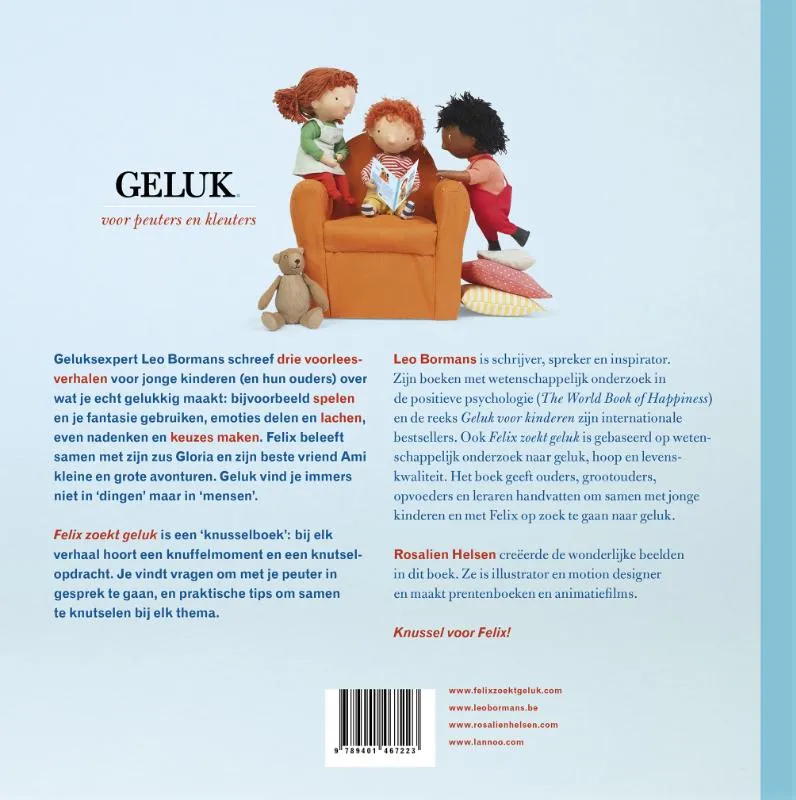 Geluksexpert Leo Bormans schreef drie voorleesverhalen voor jonge kinderen (en hun ouders) over wat je echt gelukkig maakt: bijvoorbeeld spelen en je fantasie gebruiken, emoties delen en lachen, even nadenken en keuzes maken. Felix beleeft samen met zijn zus Gloria en zijn beste vriend Ami kleine en grote avonturen. Geluk vind je immers niet in ‘dingen’ maar in ‘mensen’.