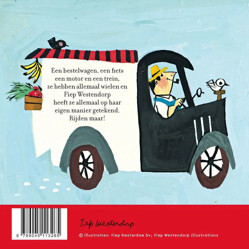 Een bestelwagen, een fiets een motor en een trein, ze hebben allemaal wielen en Fiep Westendorp heeft ze allemaal op haar eigen manier getekend.