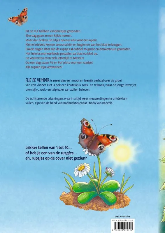 Flie de Vlinder is meer dan een leerrijk verhaal over de groei van een dagpauwoog. Het is bovenal het tweede keutelleuke zoek- en telboek van Pit & Puf, waar jonge lezertjes uren kijk-, zoek- en telplezier aan zullen beleven.